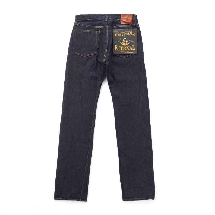 生地には、希少な旧式シャトル織機で織り上げた14.5ozオリジナルセルヴィッチデニムを採用。あえて弱いテンションでゆっくりと織ることで、ヴィンテージ特有の凹凸とザラつきのある表情豊かな生地が生まれます。特濃ロープ染色による深いインディゴは、穿き込むほどに美しい“線のタテ落ち”を描き出します。